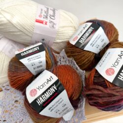 První z nich je krásně barevná příze YarnArt Harmony. Klubíčko má návin 50 g / 80 m a složení 60 % vlna a 40 % akryl. V balení je 10 klubíček a jedno klubko vychází přibližně na 49 Kč. Pokud ale objednáte celé balení a využijete akci 1 + 1 balík zdarma, dostanete druhý balík příze navíc. V takovém případě vás jedno klubíčko vyjde zhruba na 25 Kč, což je za přízi s obsahem vlny opravdu skvělá cena. Barvy Harmony si můžete prohlédnout zde Ještě stále je super výběr v barvičkách, tak si o tu svoji “navíc”nezapomeňte napsat do poznámky.  Z příze Harmony jsme si uháčkovali kulich a homelesku v jednom. Inspiraci najdete zde