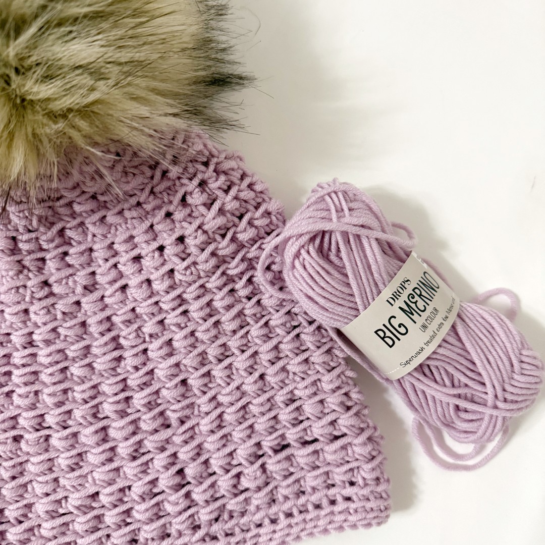 Další klubíčko bylo DROPS Big Merino, 50 g/75 m, 100% merino vlna. Příze je hřejivá a nadýchaná, ideální na čelenky, kulichy (spotřeba 2–3 klubka), nákrčníky nebo oversize vesty a svetříky. Tuto přízi jsem měla poprvé a musím říct, že to byla láska na první dotek. Příze hodně pruží, krásně hřeje, má seskané vlákno a dobře se z ní háčkuje. Dovedu si představit i háčkovanou kvalitní deku pro miminko. Z příze jsem otestovala nový vzorek z knihy Nomota – Učebnice ručních prací z roku 1935. Vzor jsem úplně netrefila, ale vznikl neobvyklý nový vzor. Na kulich pro Vás chystám nový video návod. Výběr z barev Big Merino najdete zde. Spotřeba na kulicha byla dvě klubíčka.