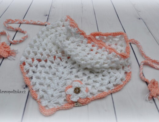 4. řada: 3 ŘO místo DS, 2 DS pod ŘO, 2 ŘO. V této řadě rozšiřujeme ve vzoru. Pod následující ŘO háčkujeme 3 DS, 2 ŘO. Dále háčkujeme 3DS-ŘO-3DS pod ŘO, 2 ŘO, 3DS pod následující ŘO. Celkem máme 5x opakování vzoru. Řadu končíme 3 DS pod ŘO, ŘO a PO. Otočíme.