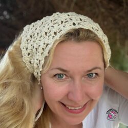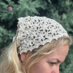 První šátek na hlavu jsem háčkovala dceři v roce 2017. Mrkněte na tento návod, kde ukazuji, jak šátek zakončit gumičkou, aby dětem lépe držel na hlavě. Letošní šátek na hlavu pro dospělé jsem doplnila o šňůrky na zavazování.