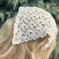 Nápad na tento šátek přišel během jednoho letního dne. Inspirací mi byla pohádka Šíleně smutná princezna, kde paní Vondráčková nosí látkový šátek uvázaný ve vlasech – jednoduchý a přesto elegantní doplněk. A právě tuhle noblesu jsem chtěla převést do háčkované podoby. Šátek Vintara háčkujeme od spodního cípu po řadách tam a zpět a zdobí ho krásný květinový vzor, který je současně vzdušný. Po stranách vzniká dekorativní krajový lem, který už není třeba nijak dodatečně upravovat.