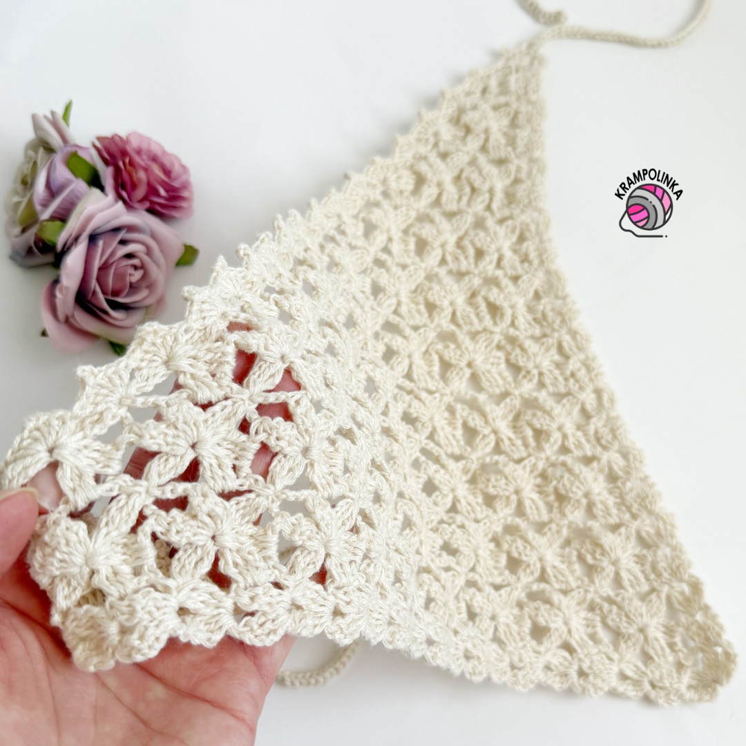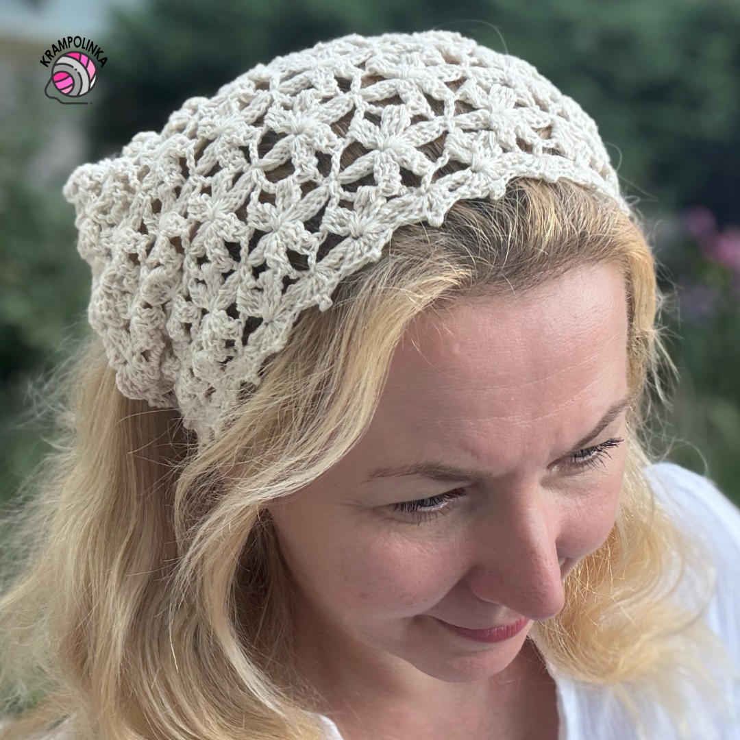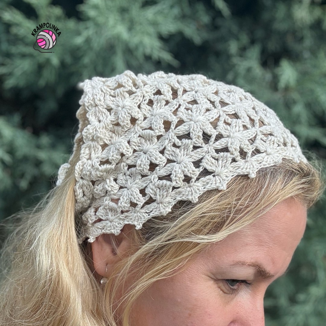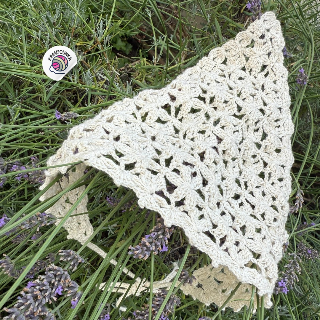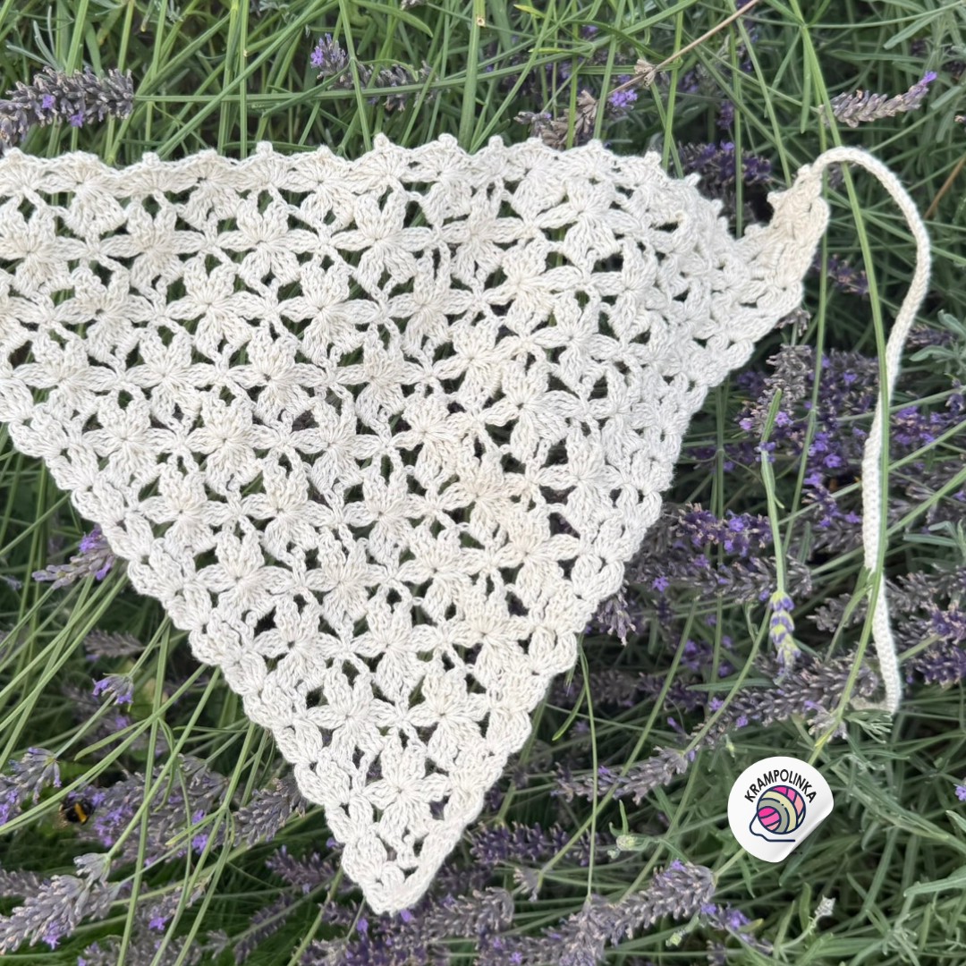 Nápad na tento šátek přišel během jednoho letního dne. Inspirací mi byla pohádka Šíleně smutná princezna, kde paní Vondráčková nosí látkový šátek uvázaný ve vlasech – jednoduchý a přesto elegantní doplněk. A právě tuhle noblesu jsem chtěla převést do háčkované podoby. Šátek Vintara háčkujeme od spodního cípu po řadách tam a zpět a zdobí ho krásný květinový vzor, který je současně vzdušný. Po stranách vzniká dekorativní krajový lem, který už není třeba nijak dodatečně upravovat.