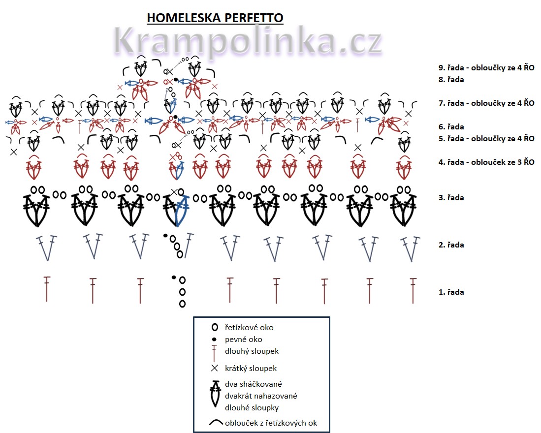 8. řada: ŘO místo KS a KS pod oblouček. Okvětní lístek do KS, okvětní lístek pod první oblouček, okvětní lístek pod druhý oblouček, sháčkujeme, ŘO. Okvětní lístek do středu kytičky a KS pod oblouček z ŘO v horní části kytičky z předchozí řady. Opakujeme do konce řady. Řadu končíme PO.