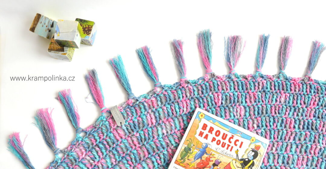 21. řada: N za KS, 3 ŘO, očko vynech, KS, opakujeme. Vzniknou obloučky, za které budeme přivazovat střapce.
