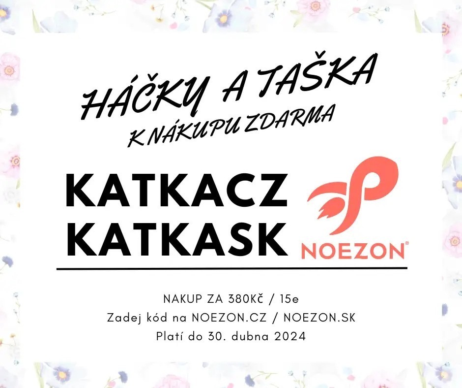Výhodou NOEZON je rychlé doručení, zásilkovna za 49 Kč a prozákaznický přístup. Současně s klubíčky jsme si rozbalili dárkový kód KATKACZ, který lze použít na NEOZON.cz a kód KATKASK pro NOEZON.sk. Stačí do 30. dubna 2024 nakoupit nad 380 Kč nebo 15 euro a k nákupu získáte praktickou látkovou černou tašku a sadu dřevěných háčků ZDARMA.