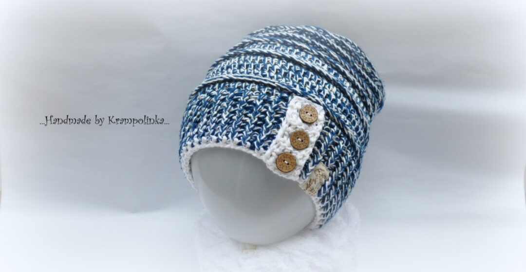 Volné konce příze zapošijeme do čepice. Pokud bychom udělali jen uzlík, může se po praní/nošení rozvázat (viskóza i bambus klouže). Poutko přišijeme k čepici a na poutko přišijeme dva nebo tři knoflíky. Vedle poutka přišijeme „značku“.