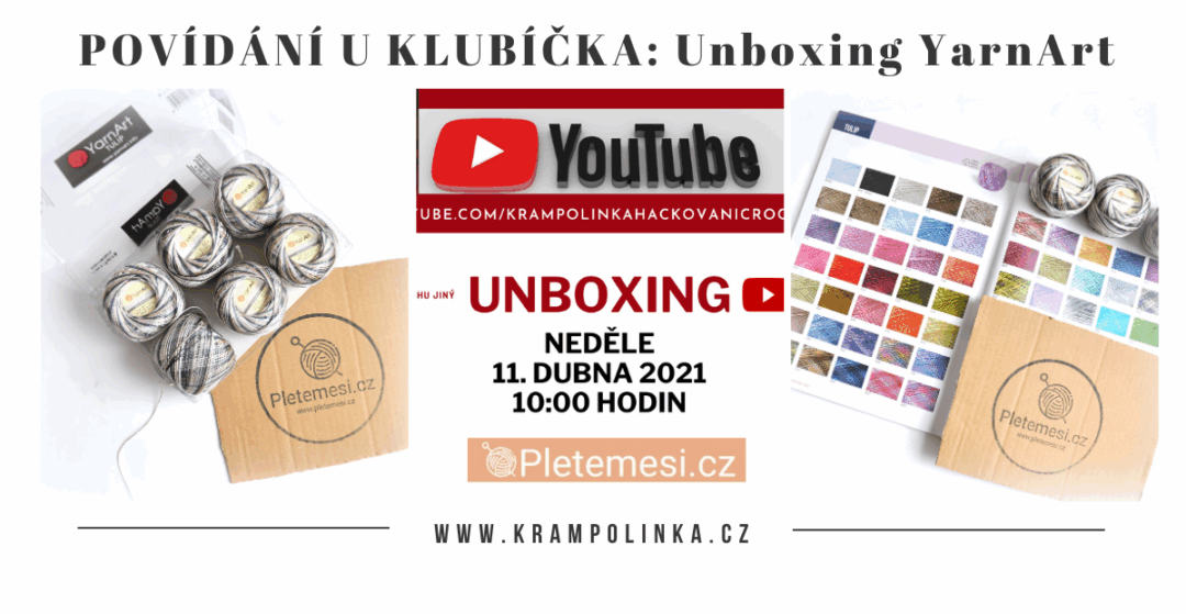- Současně by bylo moc fajn, kdyby nová rubrika Vám byla co nejvíce užitečná. I kdybychom neměli balíček k rozbalení, mohli bychom si něco společně zkusit online uháčkovat, popovídat s kávičkou o nějakém oblíbeném klubíčku nebo zkrátka prolistovat nějakou knihu se vzory, mrknout na inspiraci na netu, no zkrátka, co Vás napadne. Upoutávka na vysílání bude vždy uveřejněna na mém Instagramu nebo na FB. Pokud se však přihlásíte k odběru mého kanálu nebo kliknete na čelní stránce na zvoneček, upoutávka Vám vyskočí automaticky v momentě vysílání. Jinak vysílání na YouTube ponechám, takže budete vědět, kde ho vždy najdete.