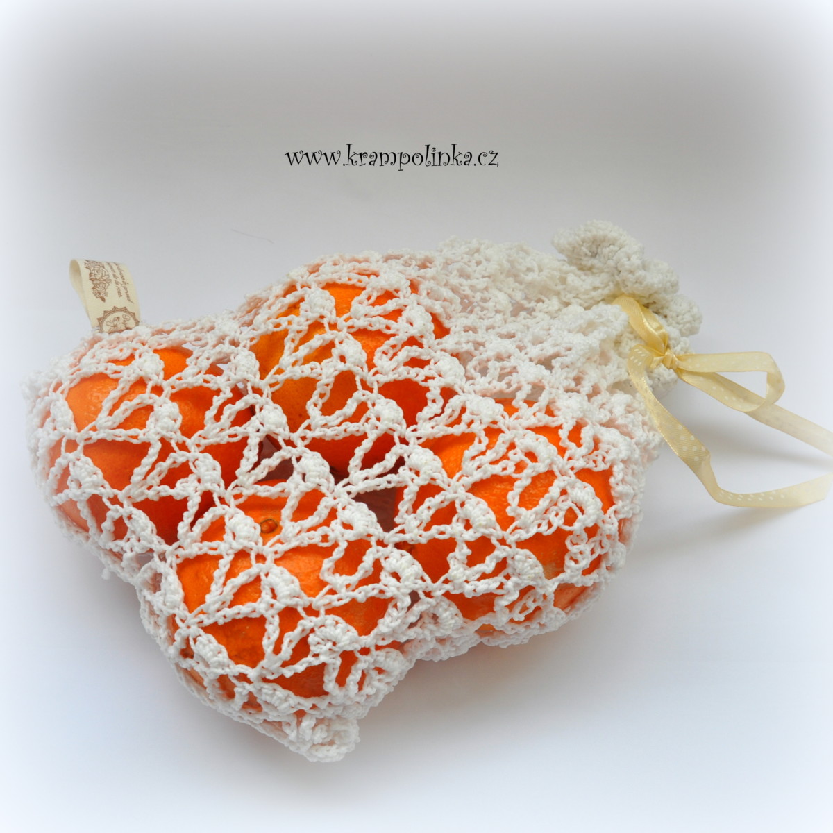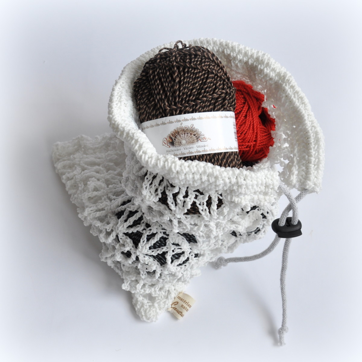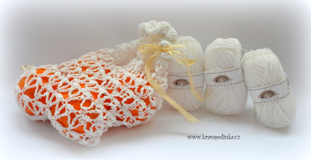Nejsem výrazně zaměřená na EKO-BIO, ale někdy mám záchvěvy pro-green záchrany světa. A tak vznikl tento sáček na ovoce/zeleninu. Zvolila jsem „tvranlivou“ přízi firmy Chemlonka Ariadne s názvem Provázková (100% polyamid). Krapet tužší materiál slibuje pevnost a pratelnost je na 40°. A pozor dámy (pánové), pytlík o rozměru 27 x 19 centimetrů pojme minimálně kilo jablek, pomerančů, mandarinek, svazek banánů atd. To nejlepší si nechávám na konec. Spotřeba – 1 klubíčko 50 g. Ano ano, takže sumasumárum cena cca 23 Kč za jeden znovupoužitelný, pratelný pytlík. Nenechte se zmást barvičkou – bílou jsem zvolila pro pocit čistoty, ale Provázková existuje i v tmavších odstínech, takže můžete ladit podle vlastních představ.