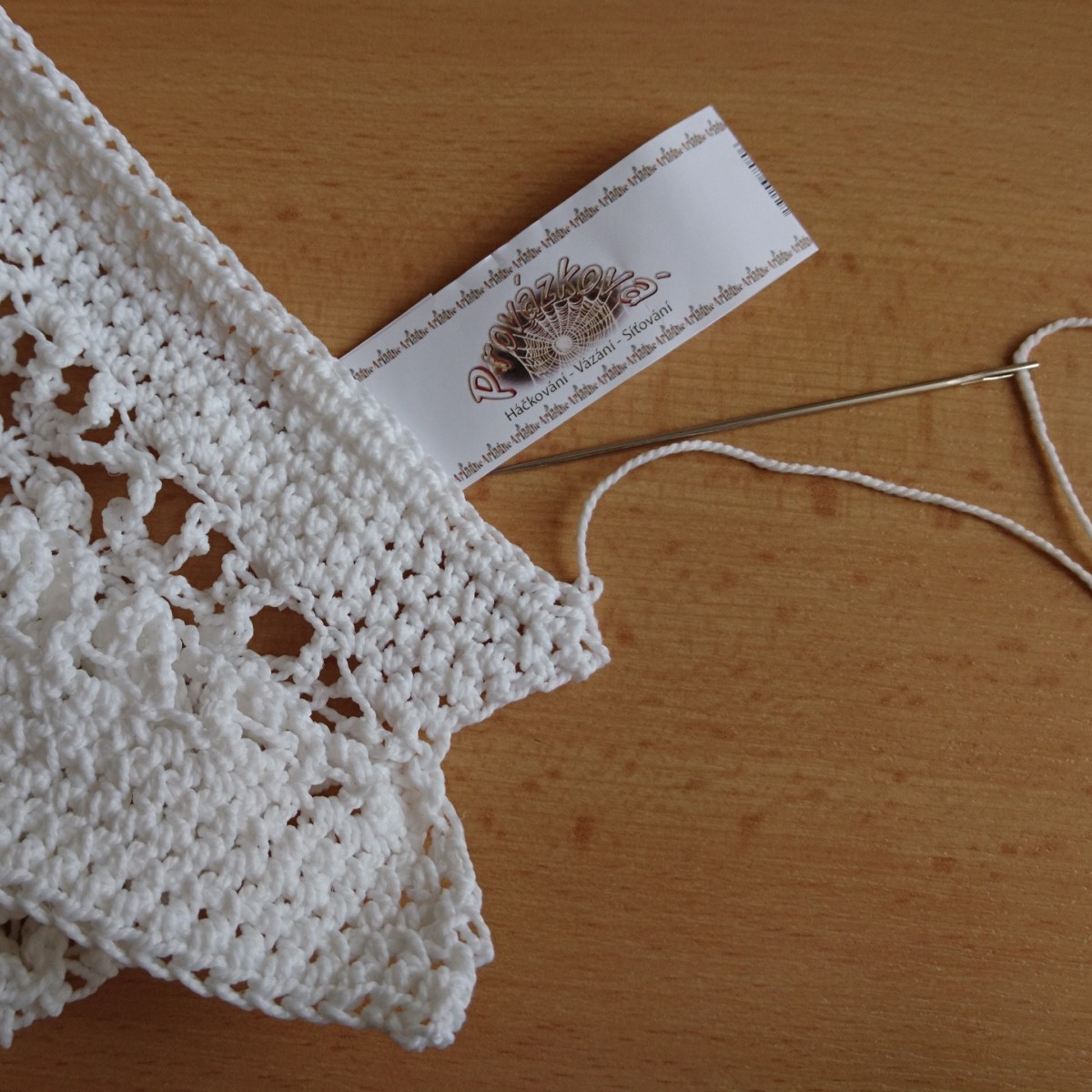 22. řada: N za PDS, háčkujeme 84 PDS do mezer, tj. háček vedeme mezi sloupky, na konci řady práci otočíme a háčkujeme zpět.