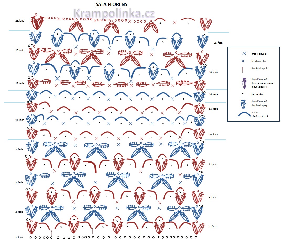 23. řada: ŘO a PO pod ŘO v krajovém vzoru. Krajový vzor, tj. 4 ŘO, dva sháčkované 2NDS-ŘO-tři sháčkované 2NDS. Háčkujeme rovný okraj šály, tj. 5 ŘO, okvětní lístek pod první oblouček, okvětní lístek pod druhý oblouček, sháčkujeme a uháčkujeme ŘO. Dále 4 ŘO a KS pod oblouček ze šesti ŘO z předchozí řady. Vzor opakujeme. Řadu končíme krajovým vzorem do středu krajového vzoru z předchozí řady, tj. tři sháčkované 2NDS-ŘO-tři sháčkované 2NDS. Přízi ukončíme.