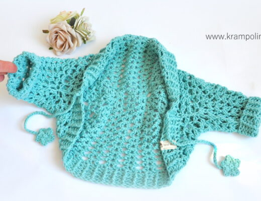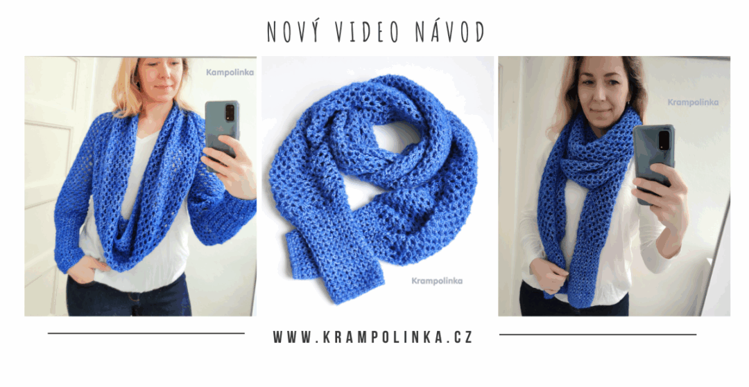 Letos, jakoby k výročí, jsem pro Vás připravila šálo svetr ze stejné příze. Co se týče střihu, jedná se o dlouhý, hodně dlouhý pruh, který je na konci sháčkovaný dohromady a na obou koncích šály jsou háčkované rukávové patenty. Kus šály nad patenty je také sháčkovaný, aby dojem rukávů byl skutečný. Díky úzkému patentu a širokému pruhu vzniknou tzv. balónové rukávy. Střih šálo svetru jsem obkoukala na Aliexpressu. Na způsoby nošení můžete mrknout i sem.