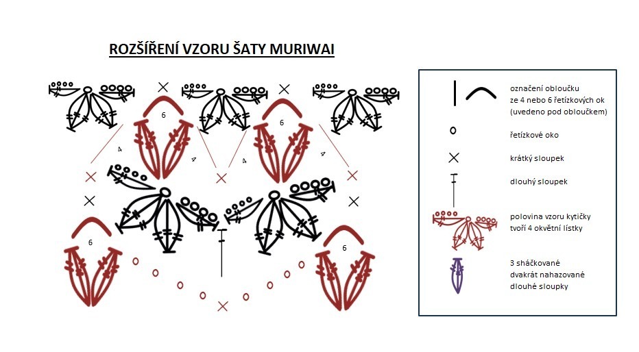 18. řada: Rozšiřujeme v řadě, ve které háčkujeme polovinu vzoru kytky, tj. 4 okvětní lístky. V této řadě budeme rozšiřovat vzor o 4 kytičky. Přeložíme si šaty na sebe a najdeme si místa prodloužení. Polovinu tvoří 12 kytek, tj. označovačem označíme krátké sloupky mezi 3 a 4 kytkou a 9 a 10 kytkou na předním díle. Stejný princip označení použijeme na zadním díle. Háčkujeme vzor kytiček. V okamžiku, kdy doháčkujeme do místa s označovačem háčkujeme KS pod oblouček ze 6-ti ŘO. Okvětní lístek 4 ŘO, 2x2NDS, okvětní lístek 3x2NDS POD OBLOUČEK ze 6-ti ŘO, 3x2NDS POD OBLOUČEK ze 4 ŘO, sháčkujeme, ŘO. 4 ŘO a 2x2NDS do sháčkovaného očka, sháčkujeme a končíme DS do KS.