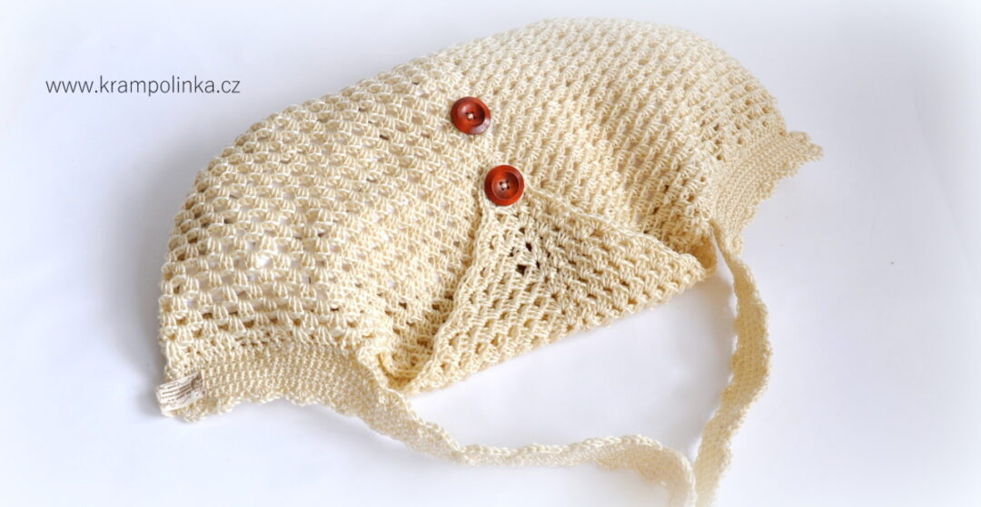 Na tašku jsem zvolila přízi Provázková Cream od firmy Chemlonka Ariadne. Je to pevný, lehký materiál s mírným perleťový leskem za velmi přijatelnou cenu. Spotřebovala jsem 5 x 50g klubíčko a přestože se jedná o seskaný chemlon, Provázková je velmi příjemná na práci. Finální výsledek (nejen u této tašky) Vás překvapí lehkostí a vzdušností výrobku. Pokud se vrhnete na nákup přízí Provázková, tak zkuste blíže prozkoumat fotky klubíček – některá totiž mají tzv. perlový zákrut. Ničemu to nevadí, jen typ Provázkové s perlovým zákrutem více evokuje síťovinu. Provázková Cream je spíše hladká.