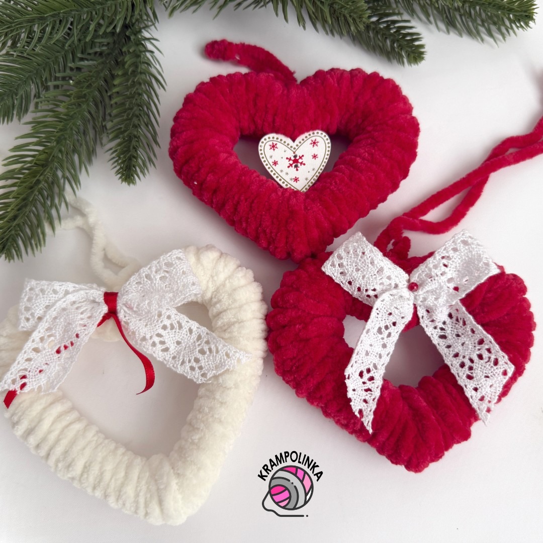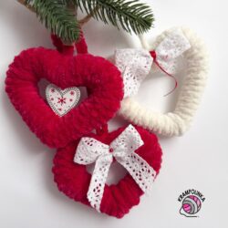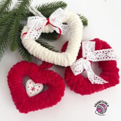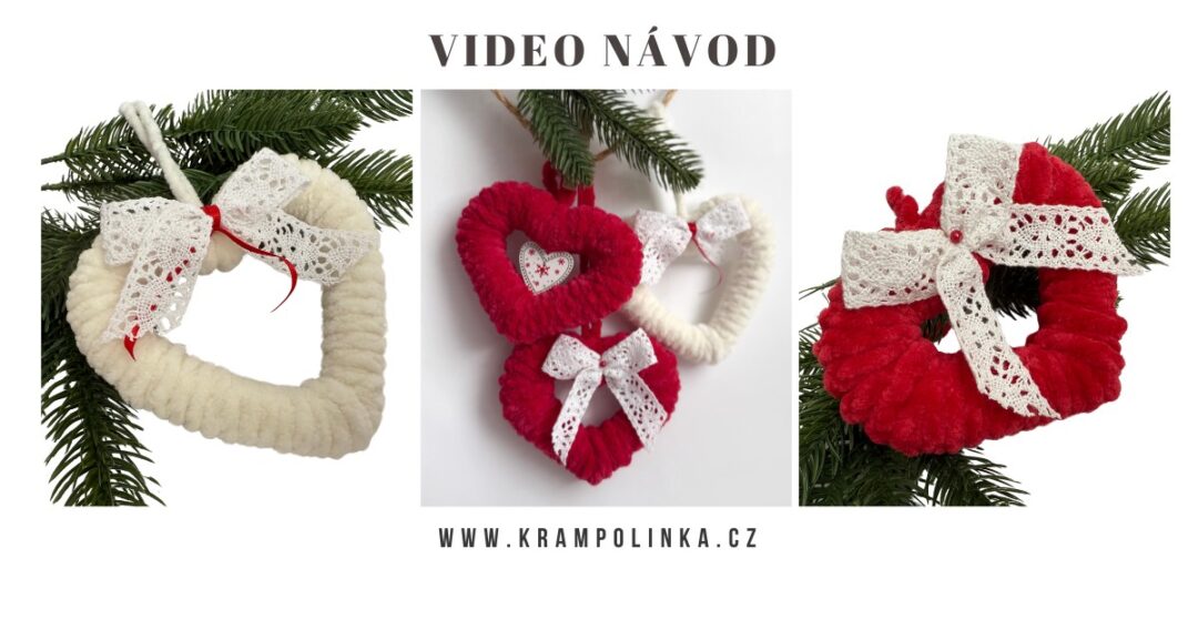 - Co se týče srdíčka, jedná se o velmi jednoduchou a rychlou dekoraci. Stačí uháčkovat základní řetízek, pořídit polystyrenový korpus ve tvaru srdíčka a korpus řetízkem omotat. Poté dozdobíme mašlí, krajkou nebo knoflíky. Na připevnění použijeme tavnou pistoli nebo kratší špendlíčky, které do korpusu zapíchneme.