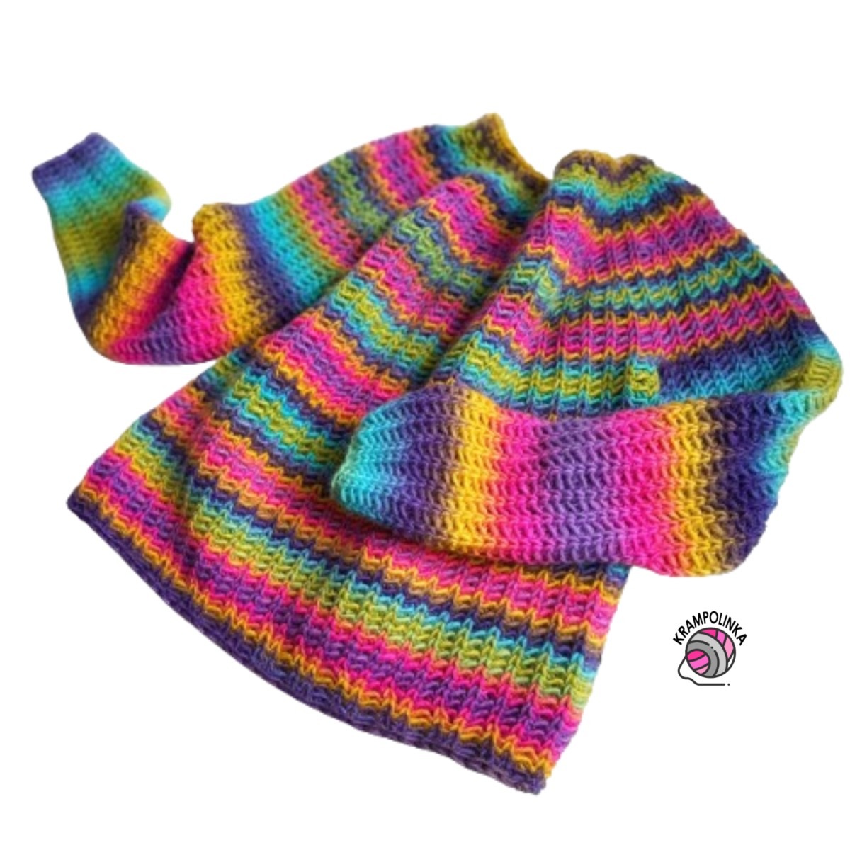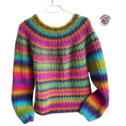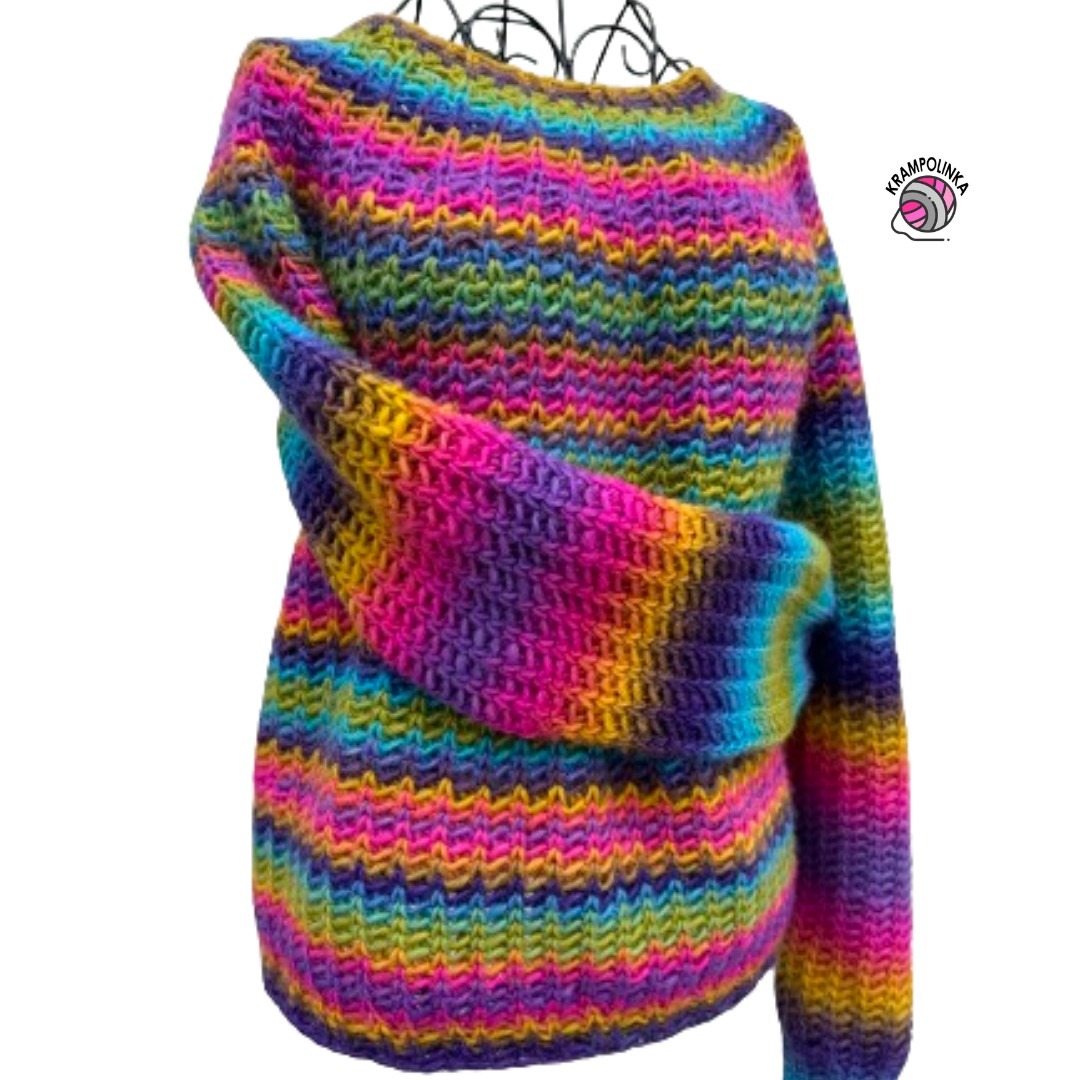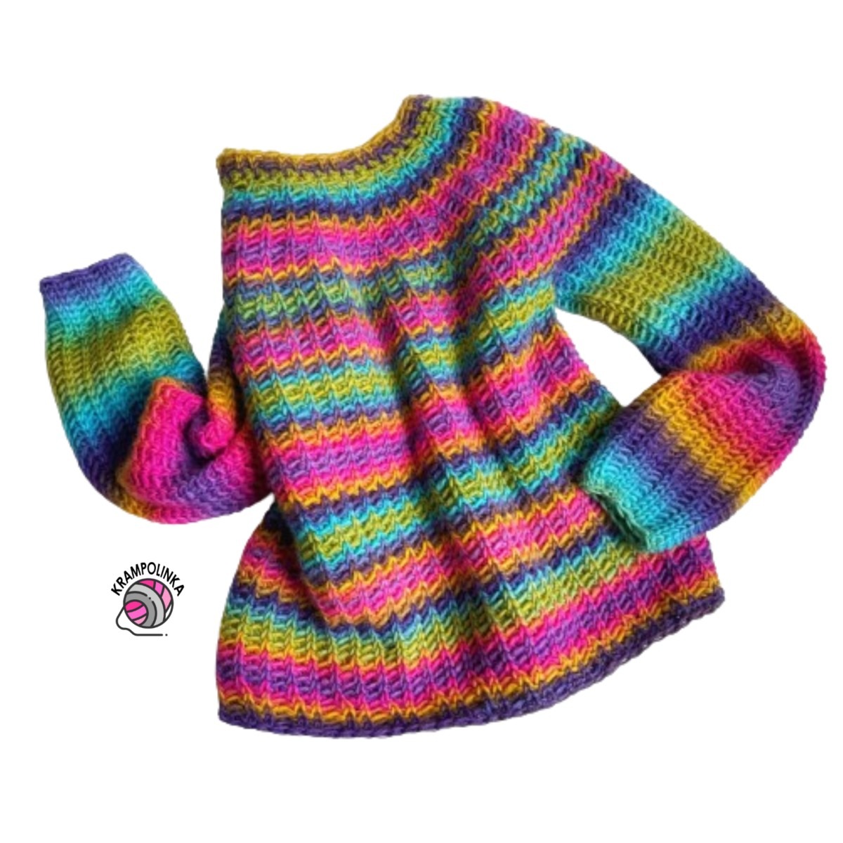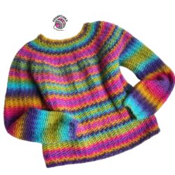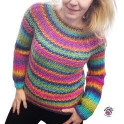 - Co se týče vzoru, zvolila jsem kombinaci propichovaného krátkého sloupku a krátkého sloupku za zadní nitku. Vzor vypadá jako pletený a použila jsem ho na homelesku Patty nebo kulich Boston. Díky této divočejší barevné kombinaci vzoruje příze Nepál Ombre jinak na těle svetru (delší řady) a jinak na rukávech (kratší řady). Pokud Vám barevnost této Nepál Obre nevyhovuje, můžete svetřík uháčkovat z jednobarevné varianty (svetr bude vypadat jako pletený) nebo si zvolit svou oblíbenou Nepál Ombre.