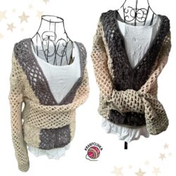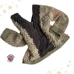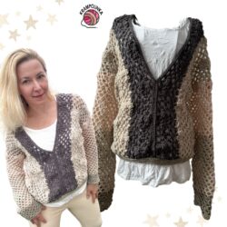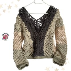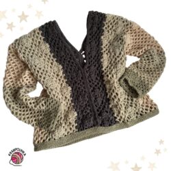 - Co se týče svetříku, jedná se od dva dlouhé obdélníky sháčkované v přední a zadní části s naháčkovanými síťovými rukávy. Háčkovala jsem z pěti různých nových barev. Spotřeba je necelých 500g. Pokud chcete pouze dvoubarevný svetřík, doporučuji pořídit dvě tmavší barvy na začátek svetříku a lemy a tři klubíčka na zbytek svetříku.