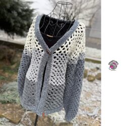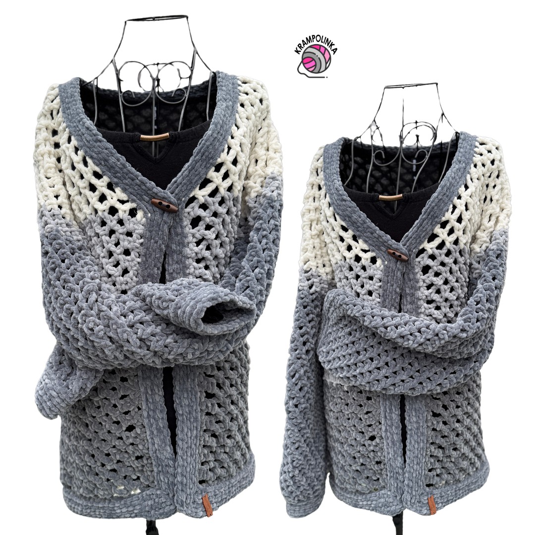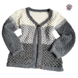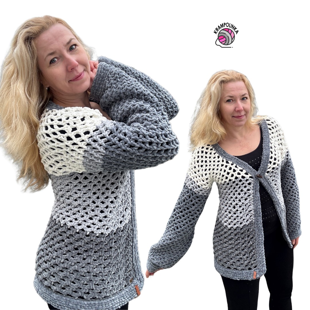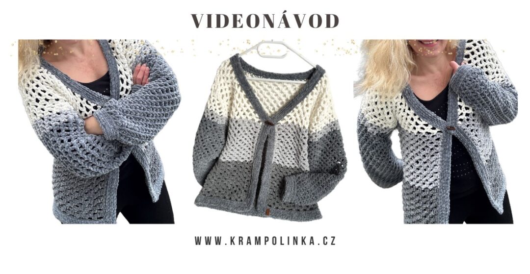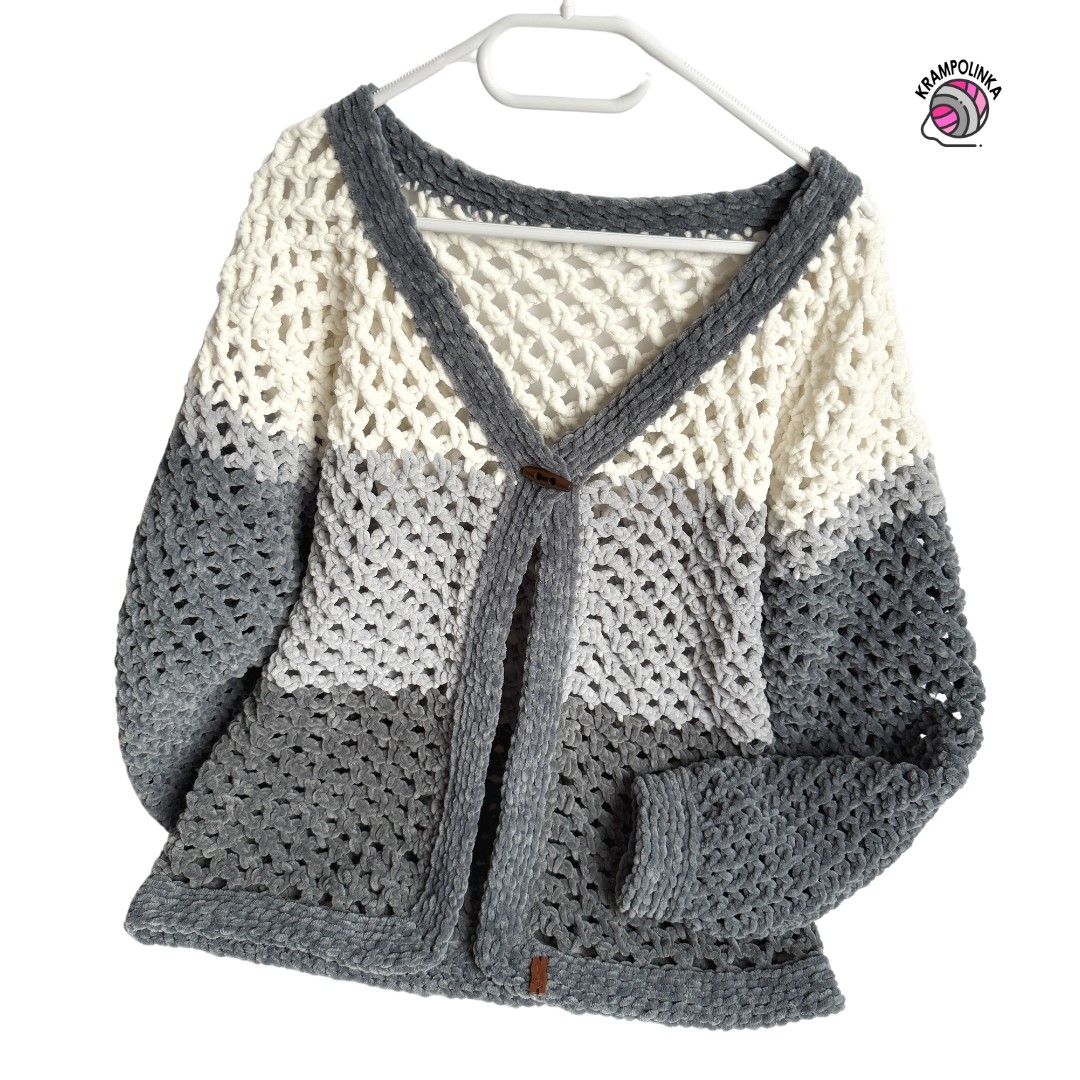 Spotřeba materiálu: Na tento projekt jsem použila tři barvy příze, tmavě šedá 4 klubka, světle šedá 1 klubko a smetanová 1 klubko. Pro rukávy jsem zbytky přízí první a druhé barvy zvážila a háčkovala z poloviny jejich váhy. Tím jsem docílila stejně dlouhých a barevně sladěných pruhů na rukávech.