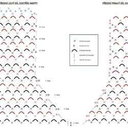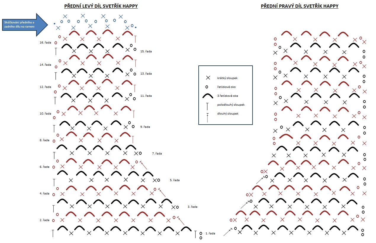 V oblasti výstřihu do „V“ háčkujeme KSRK-ŘO-KS, nebo 3xKSRK pod oblouček (do prostředního KS vložíme označovač), a pokračujeme v háčkování směrem ke krku. Po „véčkové“ části, tam, kde jsme ujímali, háčkujeme schéma 2KSRK v jedné řadě a KSRK ve druhé řadě. V rovné části výstřihu háčkujeme KSRK na jednu řadu. Kolem krku háčkujeme KSRK do KS a KSRK pod oblouček. Způsob háčkování zrcadlíme na protilehlé části svetříku. Řadu končíme PO.