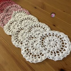 Vzor je tak úžasný a princip rozšiřování jednoduchý, že lze z duhového klubíčka háčkovat pouze kruhový ubrus. Pokud zvolíte větší háček a větší návin klubíčka, vzor na běhounu bude slušet i šále. Pozor – tento návod je spočítaný na duhová klubíčka. Při použití Moonlight, Maxi nebo tenčích přízí jiných než duhová klubíčka se může výsledek vlnit nebo kroutit. Výsledný ubrus jsem přežehlila žehličkou. Díky akrylu ubrus změkl a současně si krásně „sedl“ vzor. Běhoun není potřeba vypínat ani škrobit.