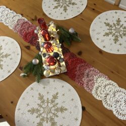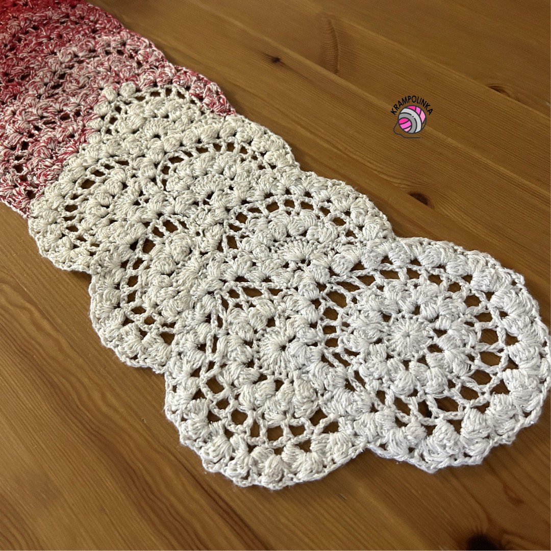 - Co se týče ubrusu, budeme háčkovat podlouhlý úzký typ ubrusu, kterému se říká běhoun na stůl. Uháčkujeme nejdříve kruh, na který bude navazovat další třičtvrtě kruh a dále půlkruhy. Budeme háčkovat po řadách tam a zpět a díky barvám v klubíčku budeme začínat bílou a budeme končit bílou barvou. Základní kruh má průměr cca 11 cm a doporučuji třínitku, max třínitku s lurexem. Šířka ubrusu i s ostatními kolečky je cca 20 cm. Délku si určíte podle toho, kolik máte materiálu nebo jak potřebujete běhoun dlouhý. Já jsem použila klubíčko 500m a uháčkovala ubrus o délce 147 cm.