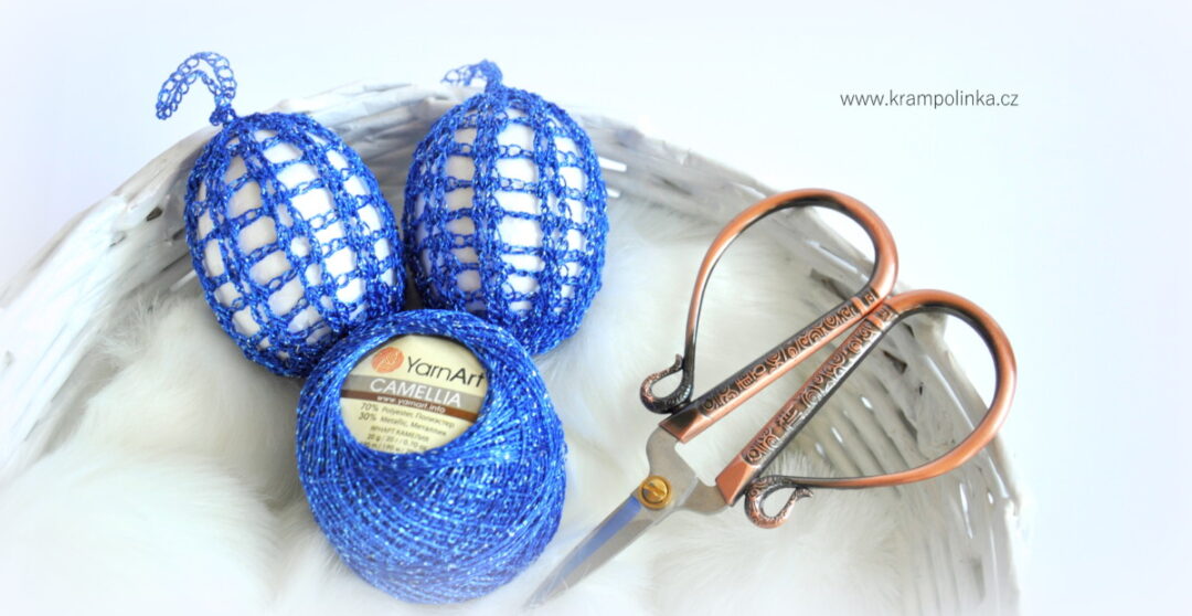 YarnArt Camellia je malé klubíčko o hmotnosti 20 gramů a návinem 190 metrů ve složení 70% polyester a 30% metalické vlákno. Camellia je krásná dekorativní příze, kterou lze využít k ozvláštnění homedecor výrobků. My si obháčkujeme velikonoční vajíčko. Záleží na Vás, zda-li uvaříte vajíčko na tvrdo a dozdobíte pár kousků z neděle na pondělí, nebo vajíčko vyfouknete případně stejně jako já vyřešíte nákupem polystyrenového výlisku.