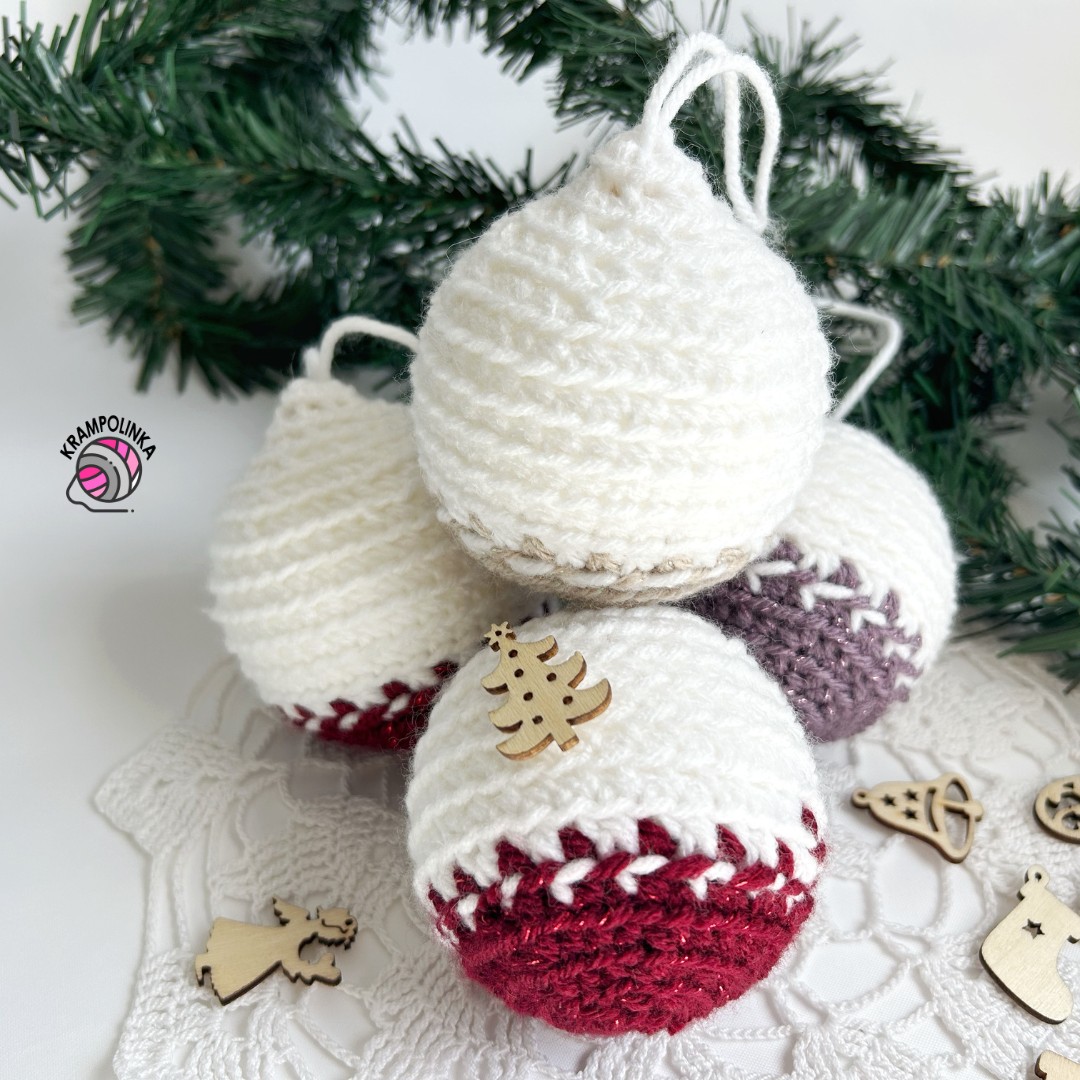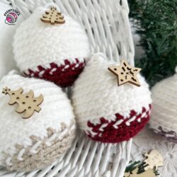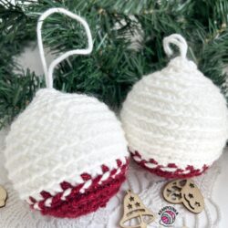 - Co se týče vánoční koule, jak se u nás říká „baňky“, háčkujeme od magického kroužku krátké sloupky za zadní nitku. Zajímavostí baňky je to, že se cca v polovině háčkování jedna řada háčkuje dvěma barvami najednou, což vytvoří zajímavý vroubkový efekt. Ten nejlépe vynikne pokud kombinujeme bílou a červenou barvu. Před dokončením do baňky vložíme polystyrenovou kouli a baňku doháčkujeme. Takto bude krásně držet tvar. Řady při háčkování neukončujeme, ale háčkujeme tzv. dokola beze švu. Používáme označovač.