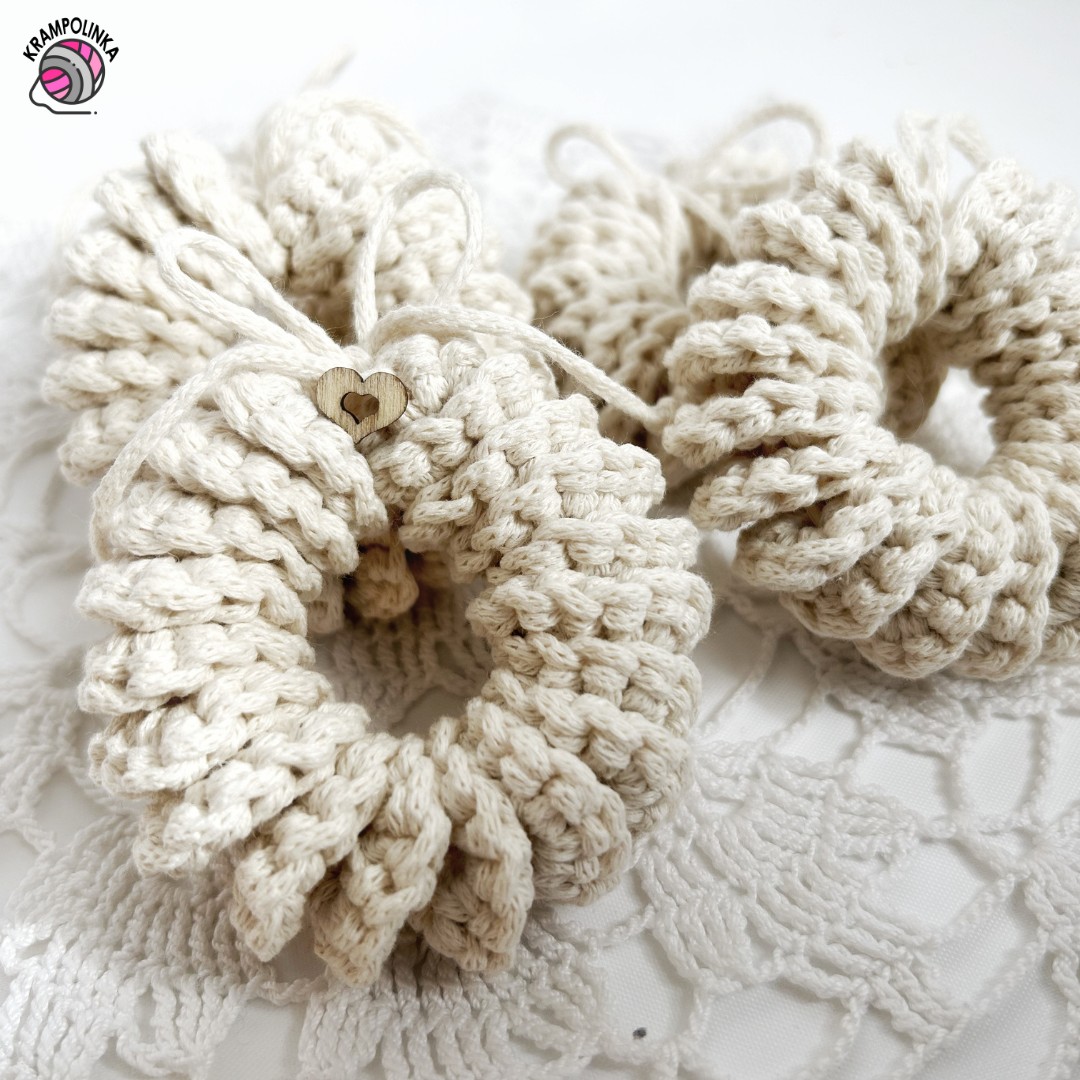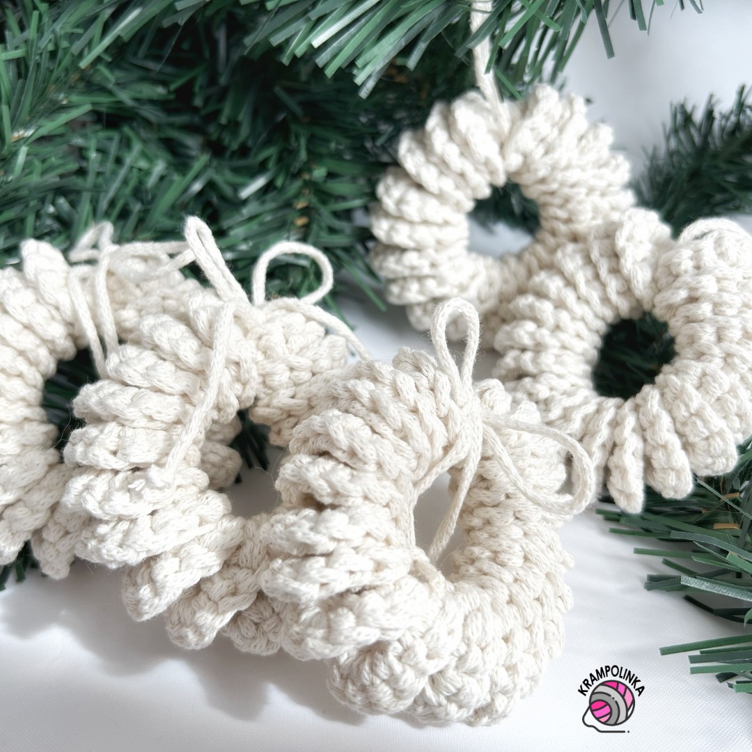• Co se týče věnečku, háčkujeme jednoduchý dlouhý řetízek, do kterého háčkujeme krátké sloupky. Je důležité základní řetízek nijak nepřekrucovat, jinak se Vám věneček nebude stáčet do spirály. Pokud se tak stane, můžete zkusit stočit spirálku po směru a základ pro věneček vytvarovat rukou. Jakmile máme uháčkovaný dostatečně dlouhý základ, stačí spojit začátek a konec a věneček můžeme dozdobit. Hodí se jako vánoční ozdoba např. i na venkovní dekor. Věneček můžeme využít k dozdobení vánočních věnců nebo vánočních dárků.